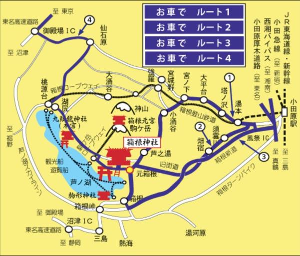 【ルート1(国道1号線経由)】東名高速道路厚木インター から小田原厚木道路の風祭インターを降り、国道1号線⇒湯本⇒宮ノ下⇒芦之湯⇒元箱根⇒箱根神社